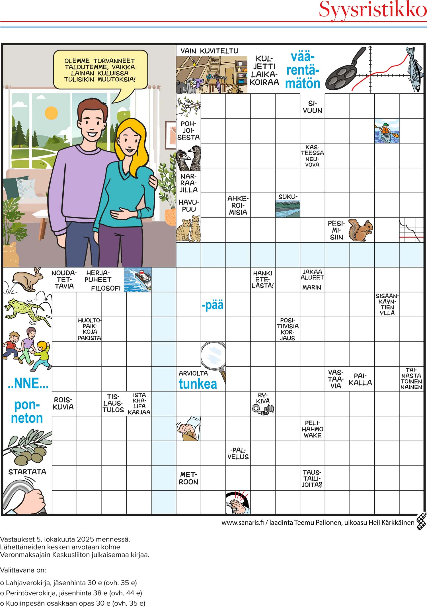 Taloustaito 8/25Tyyppi: ristikkoVaikeustaso: helppo/kesk. Laatija: Teemu Pallonen Piirtäjä: Heli Kärkkäinen |