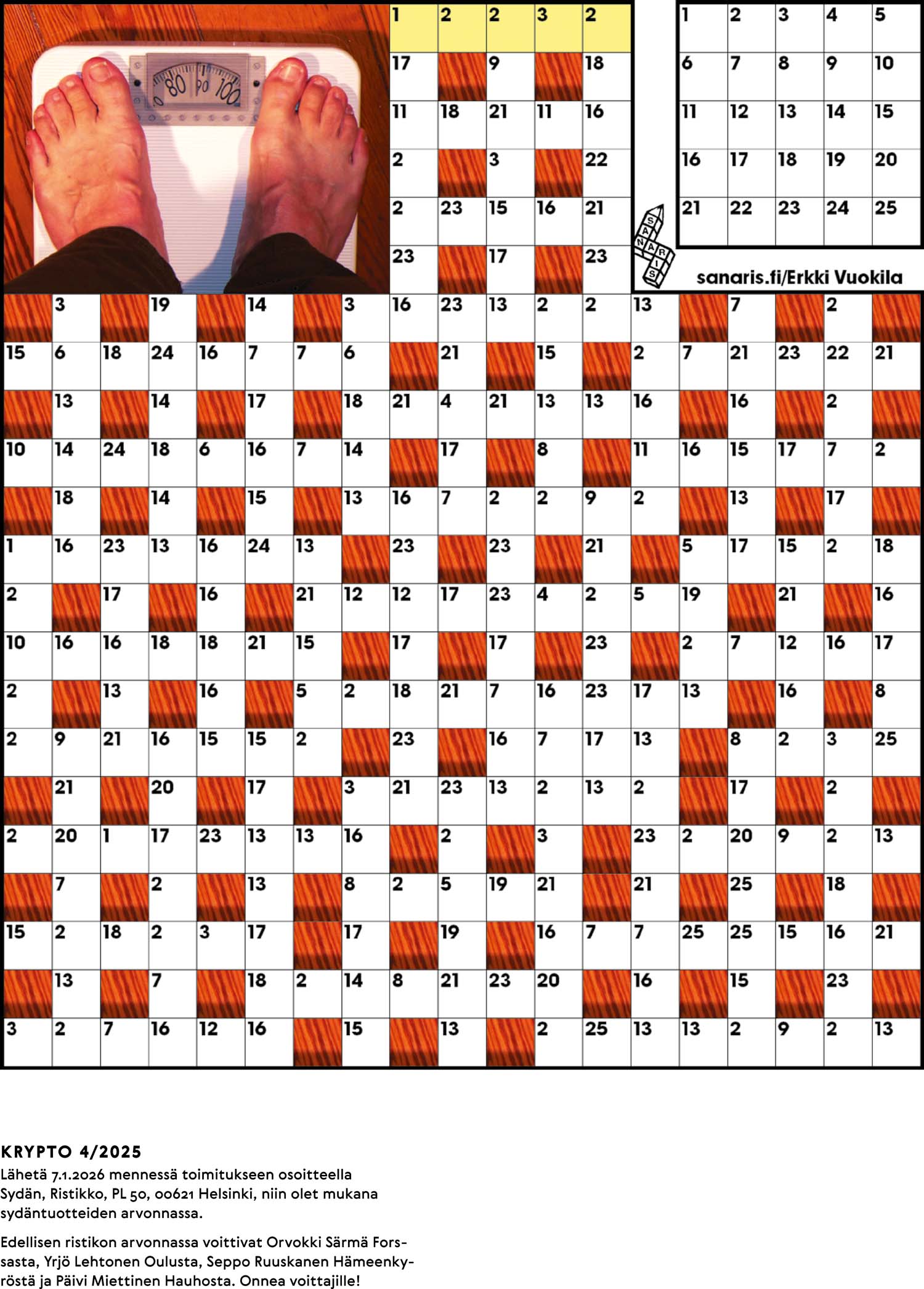 Sydän 4/25Tyyppi: kryptoVaikeustaso: helppo/kesk. Laatija: Erkki Vuokila Piirtäjä: Erkki Vuokila |